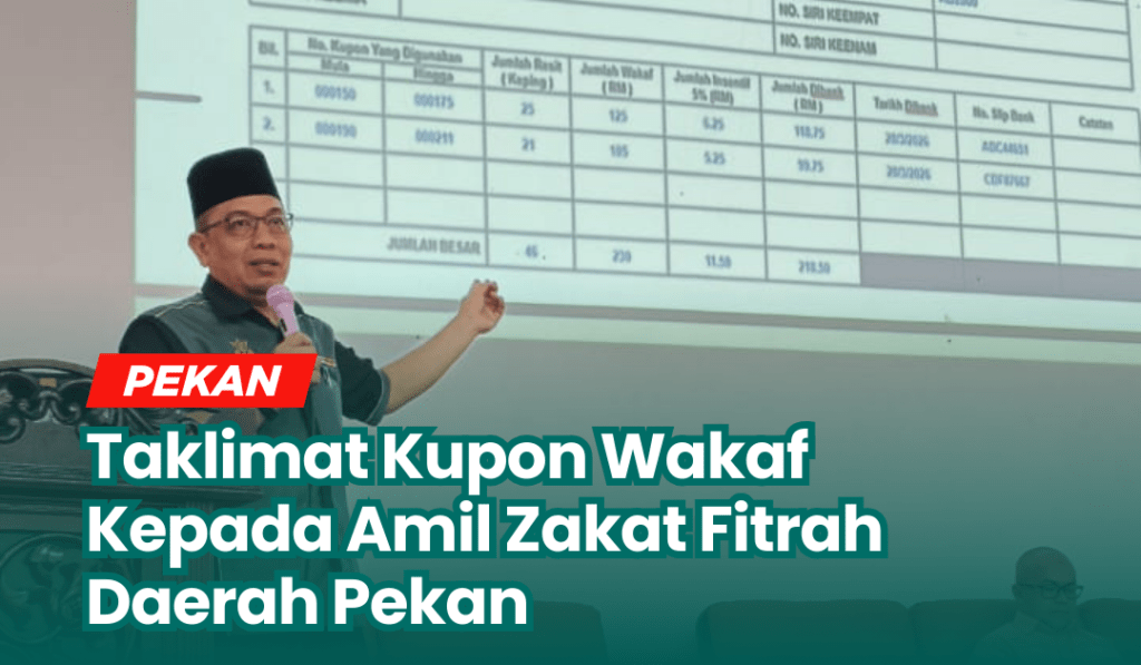 Pekan, 10 Februari 2026 – Satu sesi taklimat berkenaan Kupon Wakaf telah diadakan kepada para Amil Zakat Fitrah di sekitar daerah Pekan. Taklimat ini telah disampaikan oleh Al-Fadhil Ustaz Haji Khairul, wakil daripada Pusat Kutipan Zakat (PKZ) Cawangan Pekan. Kehadiran para amil mencerminkan komitmen berterusan dalam memperkasakan peranan mereka bukan sahaja sebagai pemudah cara kutipan […]