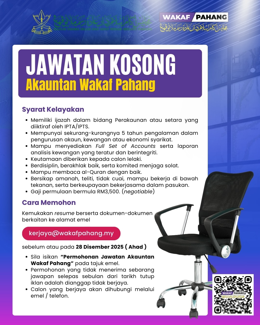 Bagaimanapun, anda dialu-alukan untuk menghantar permohonan kepada kami di alamat emel kerjaya@wakafpahang.my. Kami akan hubungi anda sekiranya terdapat penempatan kosong dalam masa terdekat.