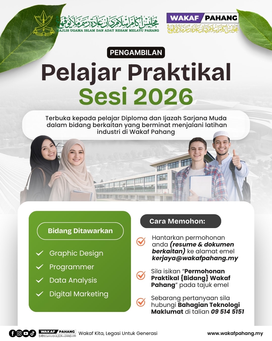 Bagaimanapun, anda dialu-alukan untuk menghantar resume anda kepada kami di alamat emel kerjaya@wakafpahang.my. Kami akan hubungi anda sekiranya terdapat jawatan kosong dalam masa terdekat.